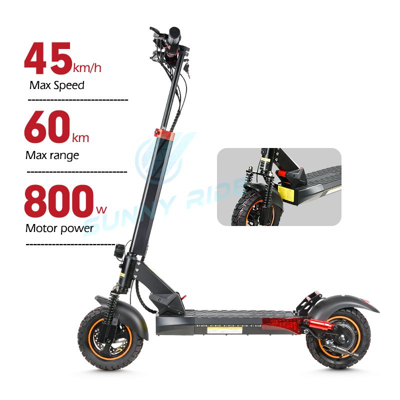 Thanks to 10" air-filled off-road tires and excellent front and rear shock absorbers, this e-scooter for adults will give you a comfortable ride.The foldable electric scooter is designed for adults who appreciate portability. With a quick folding mechanism, you can easily store or carry it, making it ideal for urban lifestyles and public transport integration.